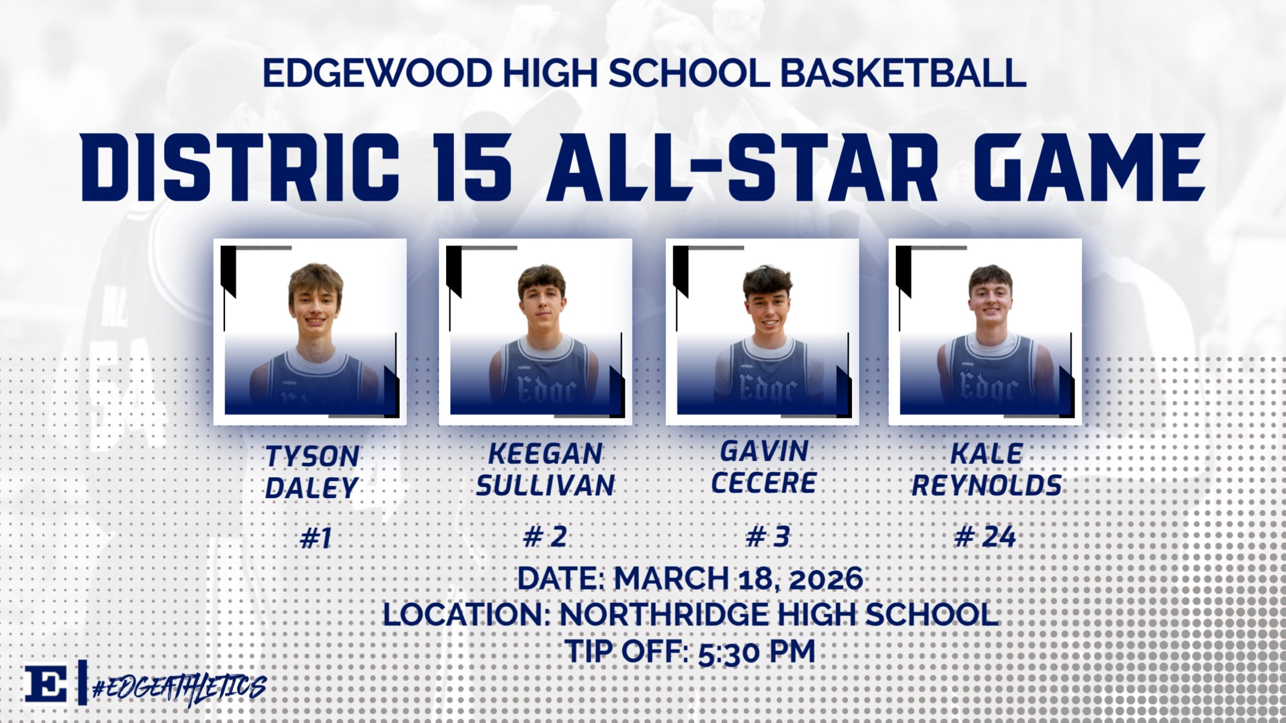 Edgewood High School is proud to announce that four of its standout basketball players have been selected to participate in the District 15 All-Star Game. The event will take place on Wednesday, March 18, 2026, at 5:30 PM at Northridge High School.