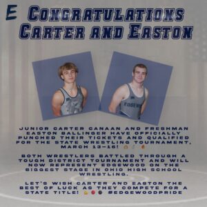 Edgewood High School will be represented at the Ohio High School Athletic Association State Wrestling Tournament by junior Carter Canaan and freshman Easton Ballinger, who
